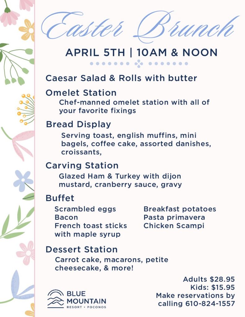 Join us on Easter Sunday, April 20th, for a festive brunch or lunch buffet held in the scenic Vista and Alpine Ballrooms at Blue Mountain Resort. Enjoy a delicious meal surrounded by breathtaking mountain views, perfect for gathering with family and friends.